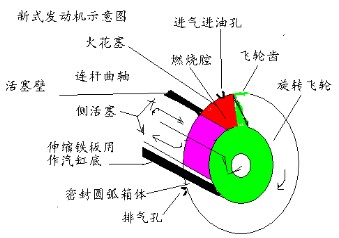 如圖所示:做功之初,提起活塞,首先將伸縮鐵板插進(jìn)密封圓弧箱體內(nèi)用作汽缸底,飛輪齒用作汽缸頂,進(jìn)油進(jìn)氣后,推進(jìn)活塞,壓迫油氣做功,飛輪旋轉(zhuǎn)帶動(dòng)車體運(yùn)動(dòng)。最后排出廢氣復(fù)位,重復(fù)做功。