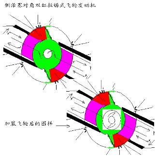 從單缸改進(jìn)為雙缸后,再加裝一個(gè)飛輪,就像自行車一樣,汽缸做功速度(踩踏速度)不影響車體速度。上面的汽缸做功時(shí),下面的汽缸充氣,下面的做功時(shí),上面的充氣。交替做功。在一個(gè)沖程內(nèi)完成二次做功。