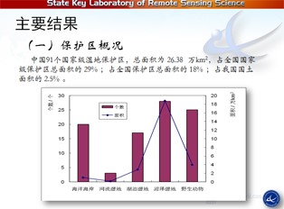 這是《科學(xué)通報(bào)》的封面,雙語(yǔ)的。下面簡(jiǎn)單匯報(bào)一下評(píng)估結(jié)果,中國(guó)91個(gè)國(guó)家級(jí)濕地保護(hù)區(qū),總面積為 26.38萬(wàn)km2,占全國(guó)國(guó)家級(jí)保護(hù)區(qū)總面積的 29% ;占全國(guó)保護(hù)區(qū)總面積的 18% ;占我國(guó)國(guó)土面積的 2.5% 。類型來(lái)看,沼澤濕地保護(hù)區(qū)最多,其次野生動(dòng)物保護(hù)區(qū),第三個(gè)是海洋類型,河流類型最少的。