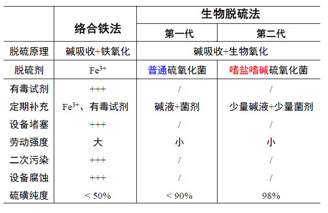 經(jīng)過中試連續(xù)運行我們發(fā)現(xiàn)嗜鹽嗜堿硫氧化脫硫體系相比傳統(tǒng)絡(luò)合鐵法具有明顯的優(yōu)勢:極端微生物可耐受的環(huán)境優(yōu)勢更為突出,僅需定期補(bǔ)充堿液及少量菌劑就可保證整個系統(tǒng)連續(xù)運轉(zhuǎn),勞動強(qiáng)度小,且系統(tǒng)回收單質(zhì)硫磺的純度高達(dá)98%。更多內(nèi)容見下表。