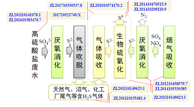 基于嗜鹽嗜堿硫氧化菌開發(fā)氣體生物脫硫及硫回收工藝,我們將其在高硫酸鹽廢水和煙氣脫硫脫硝中進(jìn)行應(yīng)用,并對關(guān)鍵流程的知識產(chǎn)權(quán)進(jìn)行了全面布局(圖1-8)。