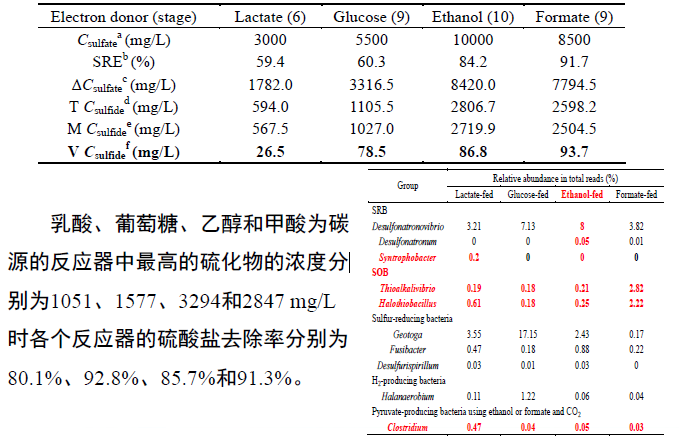 我們將嗜鹽嗜堿脫硫脫氮微生物應(yīng)用到實驗室小試煙氣脫硫系統(tǒng)中,并選擇不同碳源作為電子供體時其最佳耐受硫化物濃度以及硫酸鹽去除效率(圖1-11)。結(jié)果發(fā)現(xiàn),乙醇為碳源是可耐受的硫化物濃度可高達(dá)3000 mg/L以上,硫酸鹽的去除率在90%左右。更多內(nèi)容見下表。