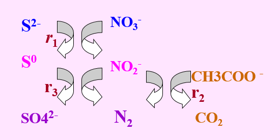 在自養(yǎng)和異養(yǎng)微生物共存條件下,硫化物和有機(jī)物(以乙酸鹽為例)的氧化途徑如圖2-5所示: