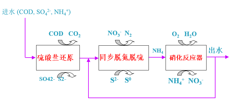 在通常條件下含硫工業(yè)廢水中同時含有大量的氮素,高含硫含氮也是制藥生產(chǎn)廢水的另一主要特征。隨著生物脫硫技術(shù)與生物脫氮技術(shù)的發(fā)展,通過研究碳氮硫共代謝體系,硫酸鹽的還原產(chǎn)物的生物氧化過程與含氮污染物反硝化過程,相互間的作用關(guān)系,提出了碳氮硫共脫除體系。