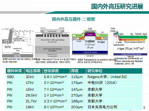 雖然在低壓領(lǐng)域SiC已經(jīng)進入產(chǎn)業(yè)。但是在高壓領(lǐng)域,不管是國內(nèi)還是國外都還處于研發(fā)階段。由于材料的優(yōu)勢,國外的研發(fā)進度要領(lǐng)先一些,日本京都大學(xué)在3年前就研發(fā)了26.5kV的PiN二極管,美國的Cree公司在也在3年前就研發(fā)了20.7kV的IGBT。國內(nèi)在引進先進的厚膜外延設(shè)備后,厚膜外延材料制備技術(shù)得到進步,最近也在高壓器件方面做了一些成績,比如中電55所在2016年報道了17kV 的PiN二極管,在2018年報道了12kV 的IGBT,說明國內(nèi)材料在一步步進度,器件的差距也和國外漸漸縮小。