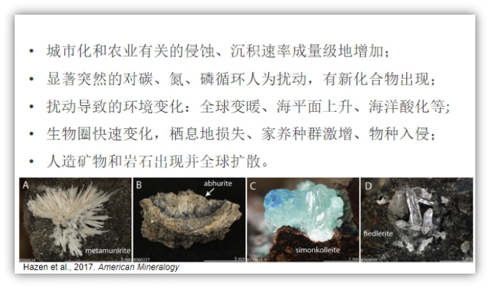國際地層委員會的人類世工作組工作了10年,總結了一些現(xiàn)象,如城市化和農業(yè)的侵蝕、沉積速率成量級地增加,顯著而突然的對碳、氮、磷循環(huán)的人為擾動,產生一些新的化合物,使得生物圈出現(xiàn)快速變化、棲息地的損失帶來植物多樣性的降低、馴化生物種群大規(guī)模增加,人類的遷徙活動等等。