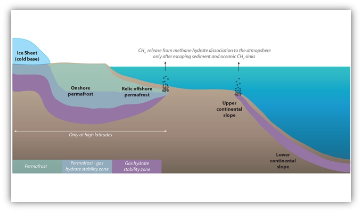 全球變暖,海洋中,深度在2000米以內的海水升溫,將導致在陸坡上存在的可燃冰(固態(tài)甲烷水合物)釋放,空氣中的甲烷會迅速氧化成二氧化碳,使二氧化碳濃度急劇增加。