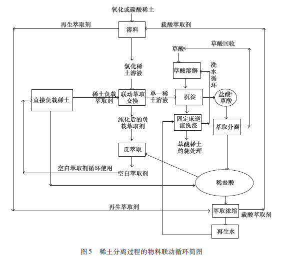 聯(lián)動萃取工藝雖然能大幅度減低分離的酸堿消耗和鹽的排放,但也不能徹底不用酸堿,消除鹽排放。我們可以從聯(lián)動萃取工藝思想拓展到萃取分離物料聯(lián)動循環(huán)達(dá)成綠色分離概念。從分離過程各個階段的反應(yīng)方程可以看到:稀土原料溶解所需要的鹽酸與稀土草酸沉淀產(chǎn)生的鹽酸是對應(yīng)的仁反應(yīng)(1)和反應(yīng)(7)酸性萃取劑萃取稀土置換出來的鹽酸與洗滌和反萃取所需的鹽酸是匹配的仁反應(yīng)(3)和反應(yīng)(6);在保證萃取效率的情況下,皂化過程仁反應(yīng)(4)」可以取消。理想狀態(tài)下,原料溶解、萃取分離,稀土沉淀洗滌等過程都能進(jìn)行物料聯(lián)動循環(huán)利用。分離過程可用方程(8)表示,只需要消耗等當(dāng)量的草酸: